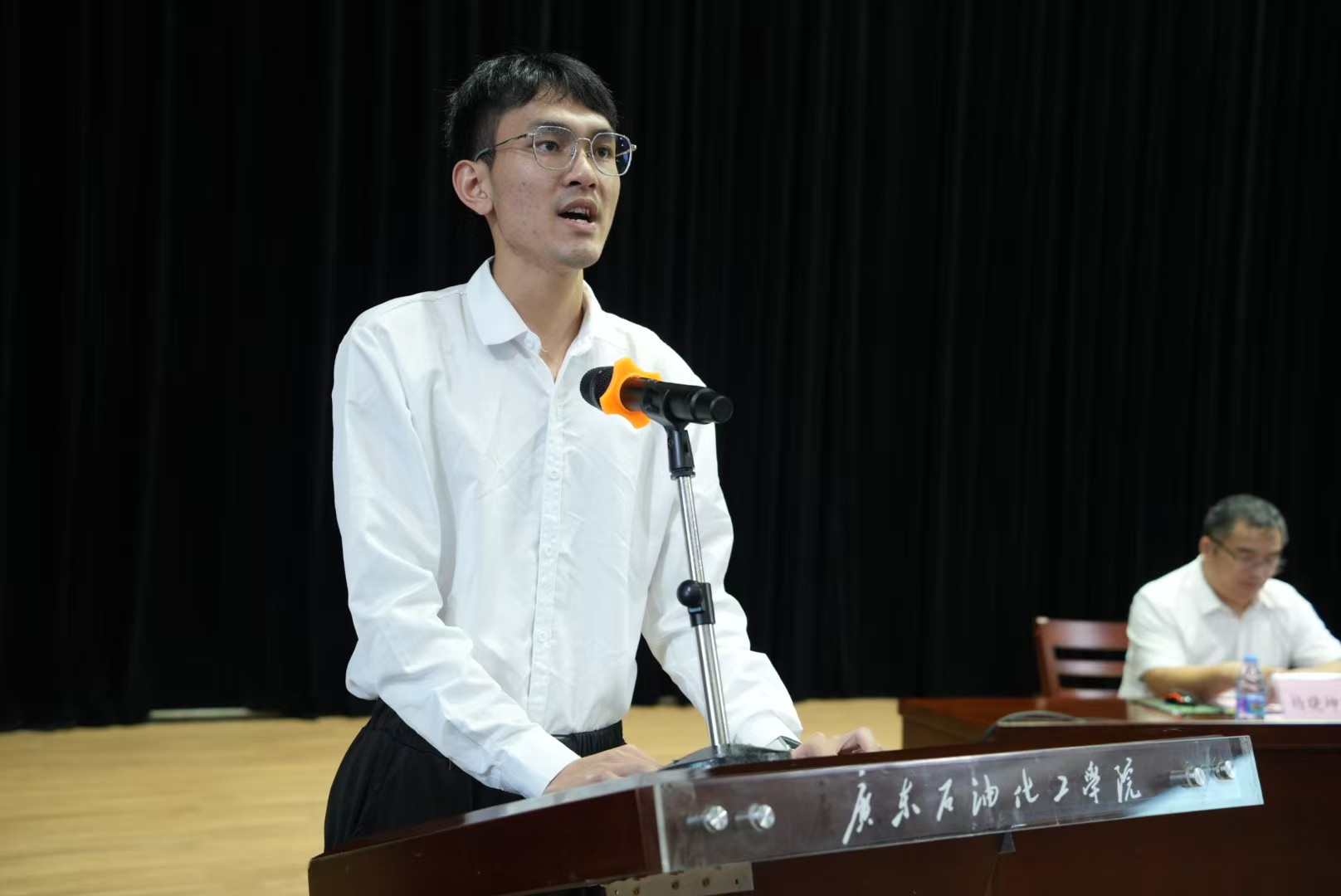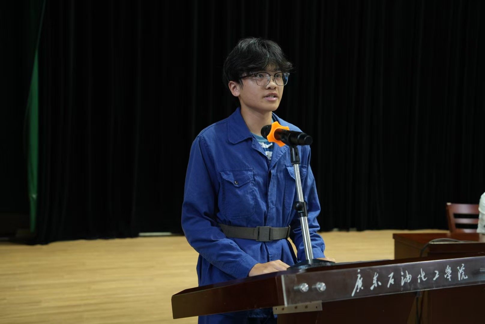 新生代表机电25-3刁桂鹏代表全体新同学发言,表示要将个人所学与国家所需紧密结合,把“小我”融入“大我”,传承前辈们攻坚克难、精益求精的工匠精神,勇于接过时代的接力棒,以青春智慧为“中国智造”注入新的活力。