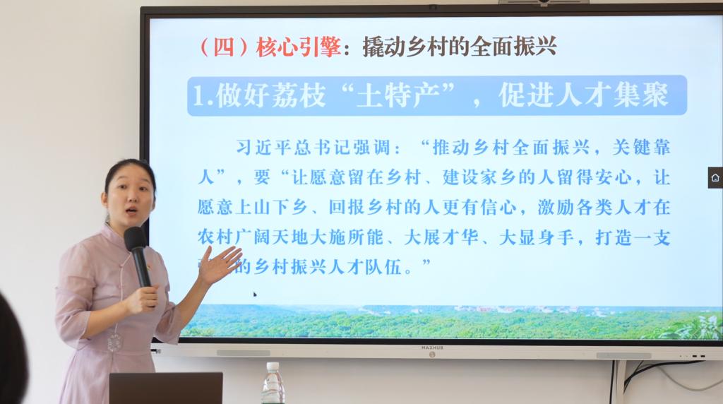 在柏桥讲堂,全体党员认真聆听市委党校决策咨询中心主任、副教授宋秀波主讲的《以产业振兴促进乡村全面振兴的茂名样板》专题党课。她系统介绍了柏桥村立足荔枝特色产业、推动三产融合的创新路径,阐释了党建引领在乡村振兴中的关键作用,增强了同学们服务乡村的责任意识。