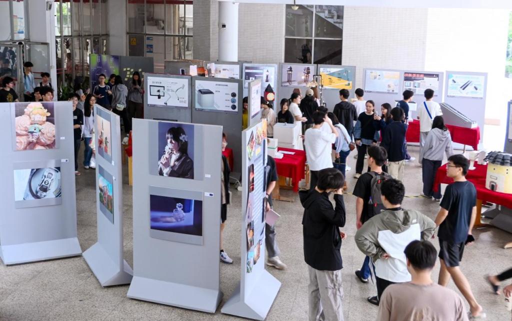 师生一起观看同学们精心制作的作品。作品的创作者们在现场解说了产品模型作品的功效性能,现场演示了产品迭代设计的功能改进,分享了自己的创新设计内涵;也向观众分享了摄影作品的创作想法。展览现场气氛热烈,观展人群络绎不绝。